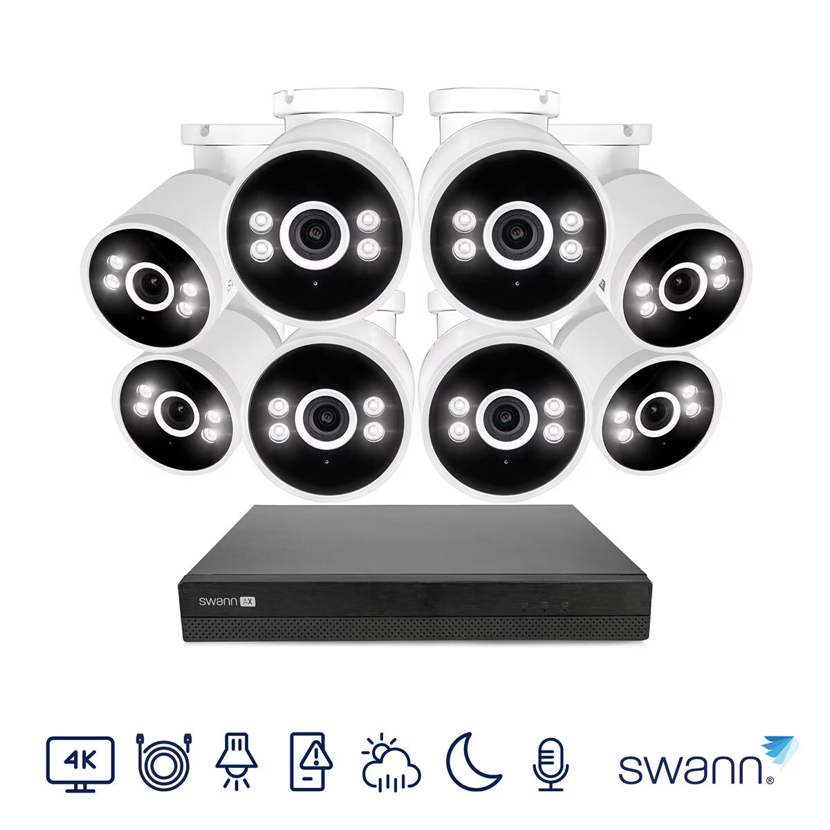 Enhance your business security with the Swann AdvancedX™ Wired 16 Channel NVR system and 8 Bullet Camera Kit, delivering unmatched 4K Ultra HD clarity for detailed surveillance. Experience superior color night vision with integrated spotlights for clear footage up to 50ft/15m in darkness.