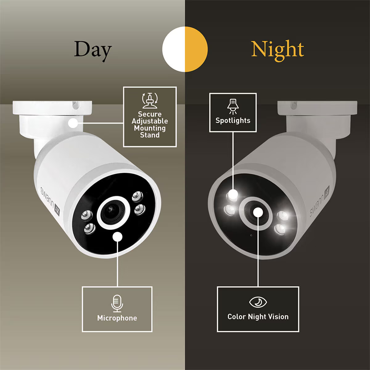 Powerful sensor spotlights ensure you can see people, objects & activity up to 50ft/15m in rich color at night.